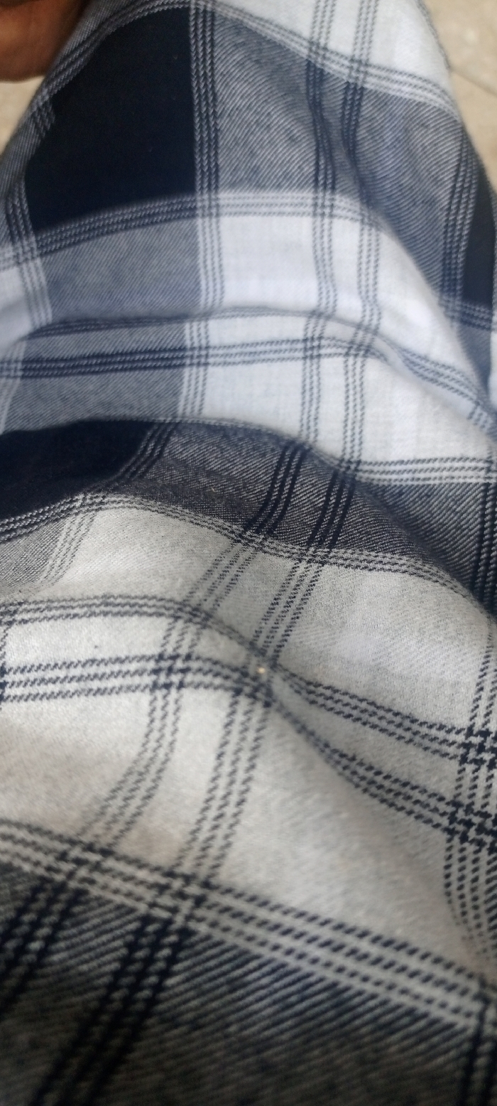 The image presents a close-up, top-down view of a crumpled plaid fabric. The textile features a pattern of intersecting horizontal and vertical lines, forming squares and rectangles. The dominant colors are white, black, and various shades of grey. Darker, thicker lines create a primary grid, while thinner, lighter grey lines run within the larger white or light grey sections. The fabric exhibits folds and creases, indicating it is not laid flat, with some areas appearing darker due to shadowing. A small, light-colored speck is visible on a white section of the fabric in the lower-middle portion of the primary image. No individuals, specific objects beyond the fabric, or environmental details are discernible. The location of Dadi Riba, Nigeria, cannot be determined from the visual content.