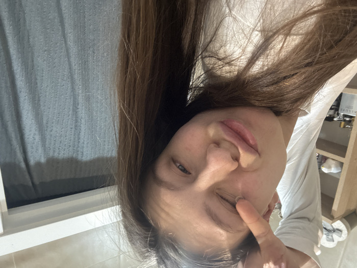 A young woman tilts her head towards the camera with her finger touching her lower eyelid. She has long brown hair and appears to be indoors. In the background, a window with a gray curtain is visible on the left. To the right, there is a light-colored wooden shelf or cabinet holding various items. The woman is wearing a light-colored top, possibly white or pale gray. The image appears to be taken from a low angle, making the person the central focus.