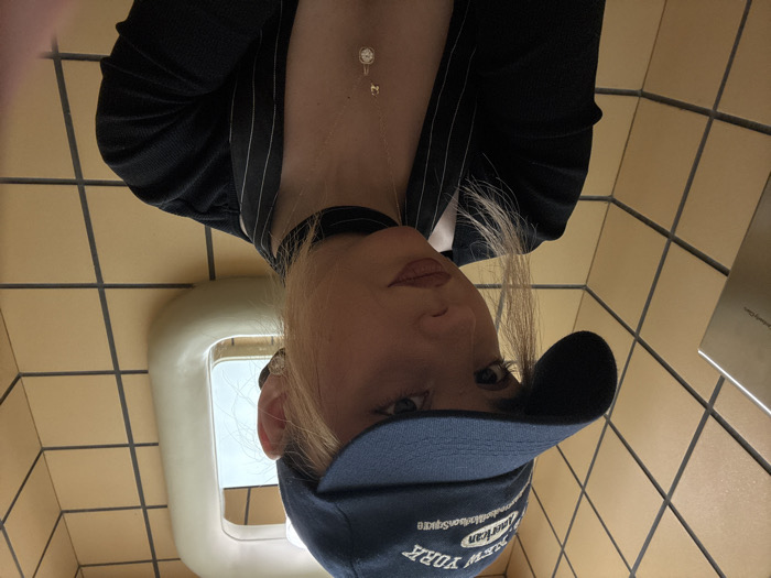A young adult female is depicted in a close-up, chest-up shot, gazing directly at the camera with a neutral expression. She wears a navy blue baseball cap with "NEW YORK American Madison Square" embroidered in white, a black choker, and a gold-colored necklace featuring two pendants, one with a clear, circular stone. Her lips are coated with a brownish-mauve lipstick. She wears a dark garment, possibly a top or cardigan, with white pinstripes visible on a lapel-like section on her right side. The background consists of light brown square wall tiles with dark grout lines. A silver-toned Kimberly-Clark dispenser is partially visible on the left side of the frame. On the right, an irregularly shaped, cream-colored fixture with a reflective surface is visible. The specific location within Yerevan, Armenia, cannot be determined from the visual information presented.