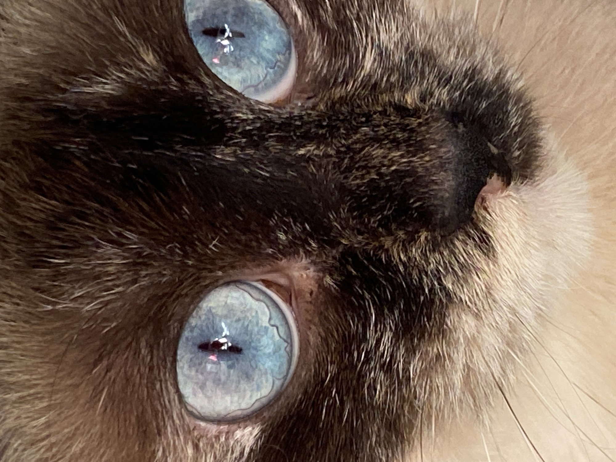 A close-up photograph shows the face of a seal point Siamese cat. The cat's face is positioned at an angle, with the eyes being the most prominent feature. The eyes are light blue, and the reflection of the environment is visible in the pupils. The cat's fur around the eyes is dark brown, gradually transitioning to a lighter beige color near the nose. The nose is small and pink. The photo is taken in a way that highlights the texture of the cat's fur and the details of its eyes. The location is not evident in the image, and it is not possible to verify that the photo was taken in the city of Chaikovsky, Russia.