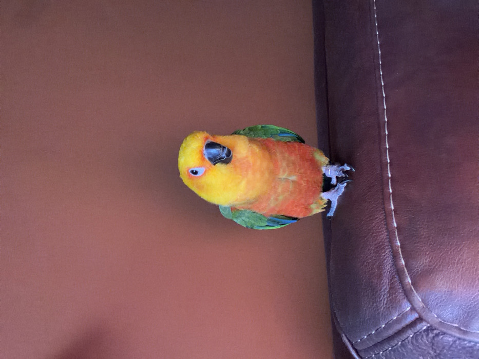 A top-down shot features a colorful bird perched on the edge of a leather couch. The bird has a yellow head, an orange body, and green wings. Its feet grip the side of the couch. The background includes a brown surface, potentially a table or part of the couch. The bird appears to be looking to the left, possibly at the camera.
