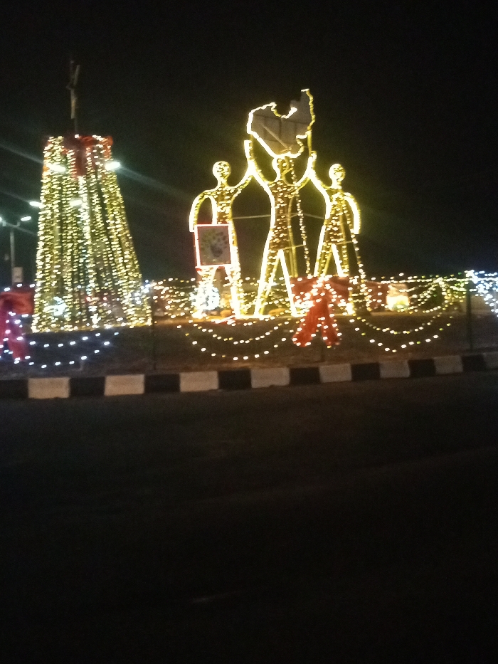 A nighttime scene showcases illuminated holiday decorations. On the left, a cone-shaped structure covered in numerous white lights, topped with a red ribbon and a tall pole. To the right, three human figures outlined in yellow lights hold up a shape. Red ribbon decorations are seen around them. Strings of small white lights line the ground. A black and white border and a dark road are in the foreground.