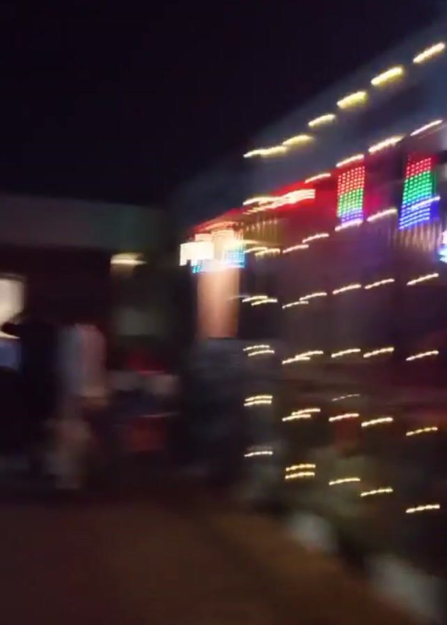 The video depicts an outdoor nighttime scene. Several people are present, some standing and some walking. The area is decorated with strings of lights, some of which are multi-colored. The scene is somewhat blurry due to camera movement and low lighting. The ground appears to be paved. Buildings are visible in the background, and there are some decorative metal railings visible.