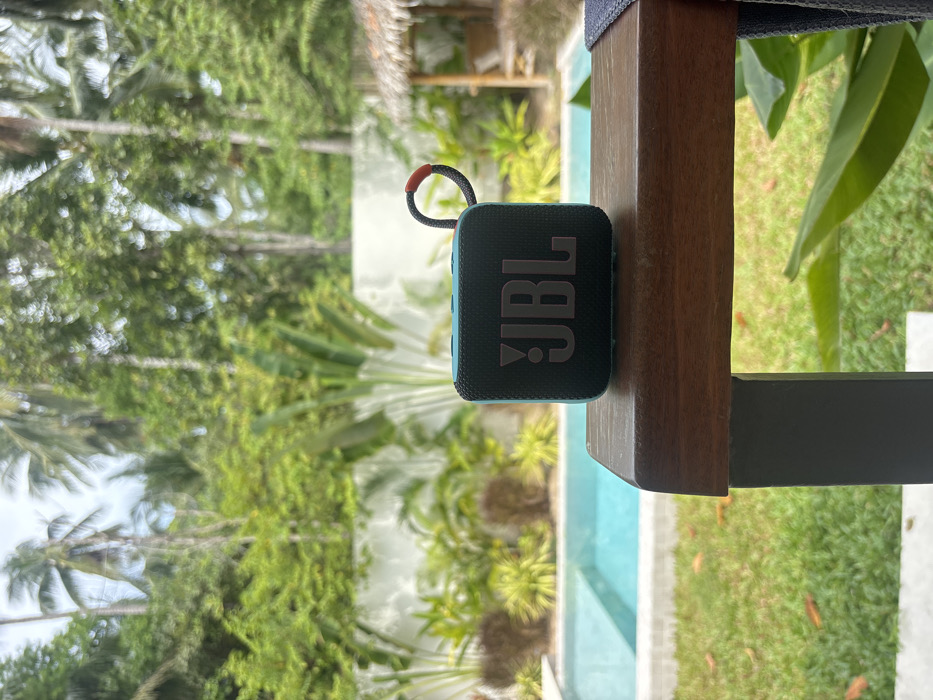 A teal JBL speaker rests on a dark wooden chair arm