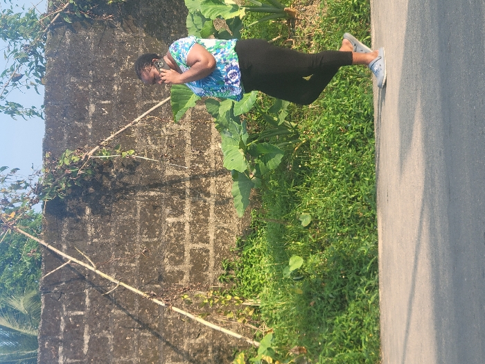 A woman with dark hair speaks on a mobile phone, standing next to a road. She wears a colorful blue and white top and black leggings, with light blue sneakers. Behind her is a weathered brick wall with creeping vines. Lush green grass and large-leafed plants fill the space between the wall and the road. The scene is bathed in bright sunlight.