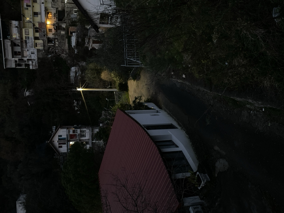 A dark, slightly rotated outdoor scene shows a narrow road running between a building with a red roof and a hillside