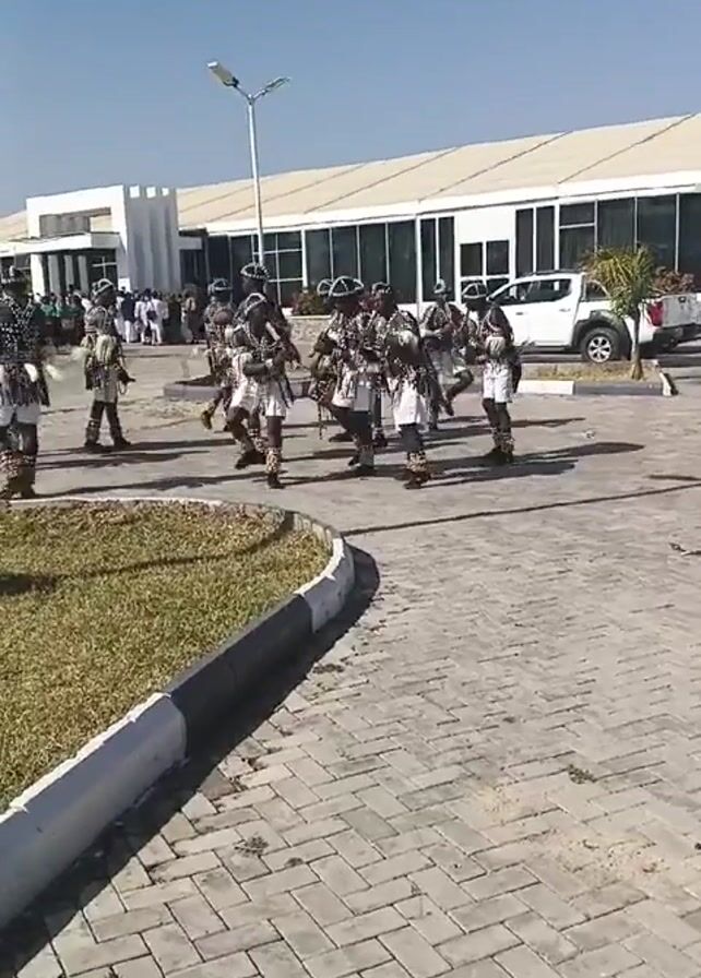 A group of people perform a traditional dance on a brick paved area in front of a building on a sunny day. The dancers are dressed in white skirts, decorative bodywear, and headdresses. They move in unison, accompanied by rhythmic music, likely drumming. A grassy area with a curb borders the paved area. In the background, a white truck is parked near the building. People dressed in white can be seen near the building as well. A tall light pole stands near the dancers.