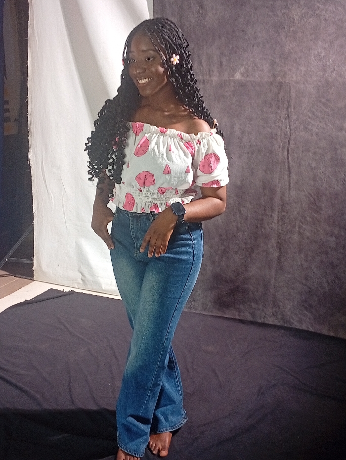 This image, located in Barakin Akawo, Nigeria, depicts a full-length portrait of a young Black female standing in a studio-like setting. The individual is smiling broadly, teeth visible, and looking directly towards the camera. Her dark, braided hair with curly extensions is long and adorned with small white and yellow flower clips near her right temple. She is wearing a white off-shoulder top featuring a repeating pink pattern and blue denim jeans. A dark-colored smartwatch is visible on her left wrist. Her right hand is placed inside her jeans pocket, and her left arm is bent with her hand resting on her upper thigh. She is barefoot, with her feet slightly crossed. The background comprises two distinct fabric drapes: a creased white fabric on the left side and a darker, solid-colored fabric, likely charcoal grey, on the right side. Both backdrops extend downwards to cover the floor area where the individual is standing.