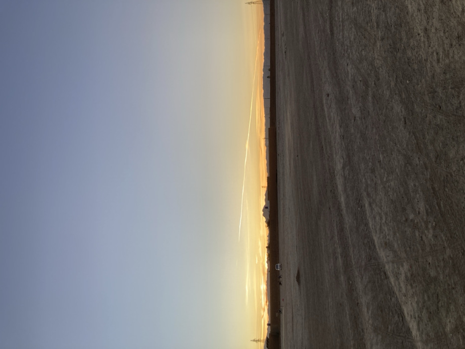 landscape divided roughly in half. On the left, a gradient sky transitions from light blue to yellow near the horizon. On the right, textured, gray ground covers the other half, with tire tracks visible. A fence line sits between the sky and ground, with what appear to be power lines and structures along the horizon. The entire image is rotated 90 degrees counterclockwise.