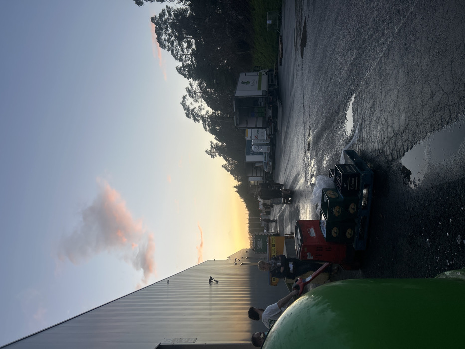 This image captures an industrial loading area in Marche-en-Famenne, Belgium, at dusk or dawn. The sky displays a gradient from light blue overhead to orange and yellow at the horizon, featuring a distinct, irregular pink cloud formation in the upper left quadrant. A large, grey, corrugated metal building with external lighting fixtures extends along the left side of the frame. To the right, a dense stand of dark coniferous trees, likely pines, crowns an elevated bank, silhouetted against the low sun. The ground consists of dark, wet asphalt or concrete, exhibiting numerous puddles and visible cracks. In the foreground left, a large, rounded green object, possibly a recycling bin or storage container, is partially visible. Immediately adjacent to it, a red manual pallet jack supports a blue wooden pallet laden with several green crates, some bearing labels such as "Grimbergen" and "Primus", along with white bags. Multiple individuals are present throughout the scene. On the far left, two men stand near the green object; one, dressed in a white t-shirt, is positioned near the red pallet jack. In the mid-ground, a woman in a dark jacket stands near yellow industrial bins. Further into the background, additional figures are observed, some pushing hand trucks or trolleys, indicating active material handling. Along the right side of the paved area, a line of several large cargo trucks or lorries are parked with their rear doors open, suggesting ongoing loading or unloading activities. One truck is partially identifiable with "Poulet..." on its side. White temporary barriers are visible in the distant right background.