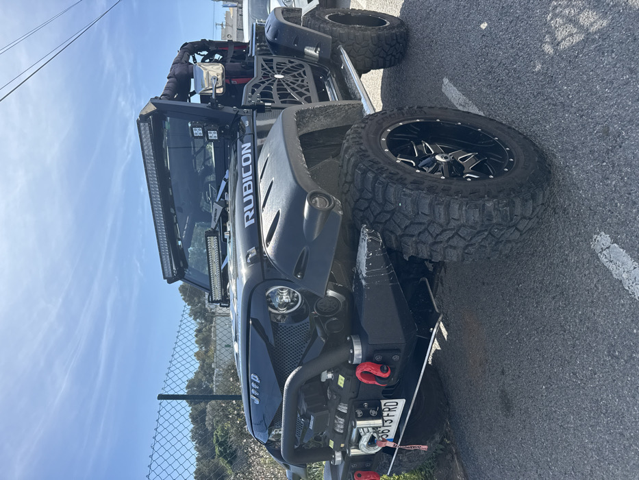 A black, heavily customized Jeep Wrangler Rubicon, license plate 3615 FRD, is parked on an asphalt surface