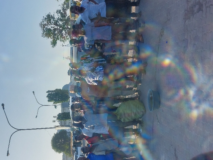This image captures a group of approximately 18 to 20 adult males standing on a paved surface in an outdoor urban environment, identified as Dar es-Salaam, Tanzania. The men are positioned in a loose crowd, generally facing forward towards the camera. They wear assorted casual clothing, including t-shirts, collared shirts, and trousers; one individual in the front row on the right wears a grey t-shirt with the word "Supreme." In the foreground, a green plastic basin containing water is centered on the light-colored interlocking pavers. To its left, a large, light green sack stands upright. A small, dark stick or piece of debris is visible on the ground near the basin. The lower half of the image and portions of the individuals are significantly affected by a prominent circular lens flare exhibiting rainbow spectral patterns. The background shows a clear, bright sky, suggesting daytime conditions. Two tall, dark street light poles with multiple luminaires are visible against the sky. Behind the group, several vehicles, including what appear to be public transport buses or vans, are parked or in transit. Green trees and indistinct urban buildings are also present in the mid-to-far background. No specific actions or interactions beyond standing are discernible among the individuals.