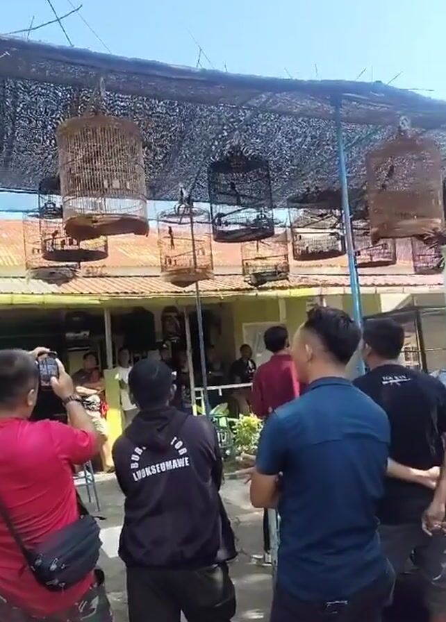 group of people gathered outdoors, observing birds in cages. The birds are hanging from a metal structure covered with netting, providing shade over an area near a house. Several men are visible, dressed in casual clothing. One man is taking a photo with a phone. The environment suggests a backyard or courtyard setting, with clear skies overhead. Some of the men appear to be attentively watching the birds, while others are standing around, possibly engaged in conversation.