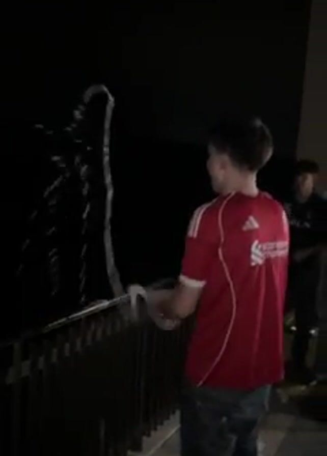 A young man in a red Liverpool soccer jersey and blue jeans is on a balcony at night, shaking a bottle of champagne and spraying it out