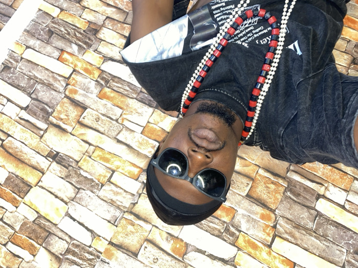 A male individual is depicted in a close-up, selfie-style photograph, captured from the upper torso upwards. He has dark skin, a trimmed beard, and is wearing dark sunglasses that obscure his eyes. A black head covering, appearing to be a durag, is visible on his head, and his lips are slightly pursed. He is dressed in a dark, possibly faded black t-shirt featuring a white graphic print on the left chest area. Adorning his neck are multiple necklaces: several strands of white, spherical beads, layered with at least two strands of alternating red and black cylindrical beads. The background is a wall featuring a patterned wallpaper or finish designed to resemble irregular, stacked stone bricks in various earthy tones, including brown, tan, and grey. This scene is located in the city of Ado, Nigeria.