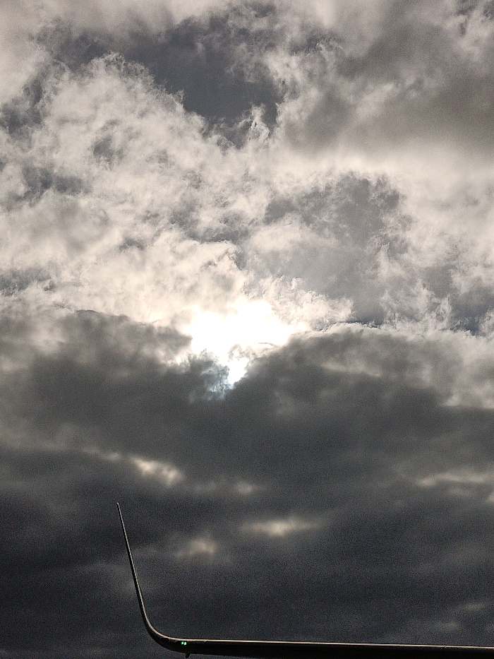 The image presents an overcast sky dominated by dense, multi-layered grey clouds. A bright light source, likely the sun, is partially obscured by these clouds in the upper-middle section, creating a luminous area that casts brighter tones on the surrounding cloud formations and darker shadows below. In the lower right quadrant, a dark, silhouetted structural element extends upward and to the left, curving before tapering to a sharp point. Two small, distinct green lights are visible on the horizontal segment of this dark object. No individuals, animals, or specific actions are depicted. The environment consists solely of the sky and this foreground structure. This scene is located in the city of Telde, Spain.