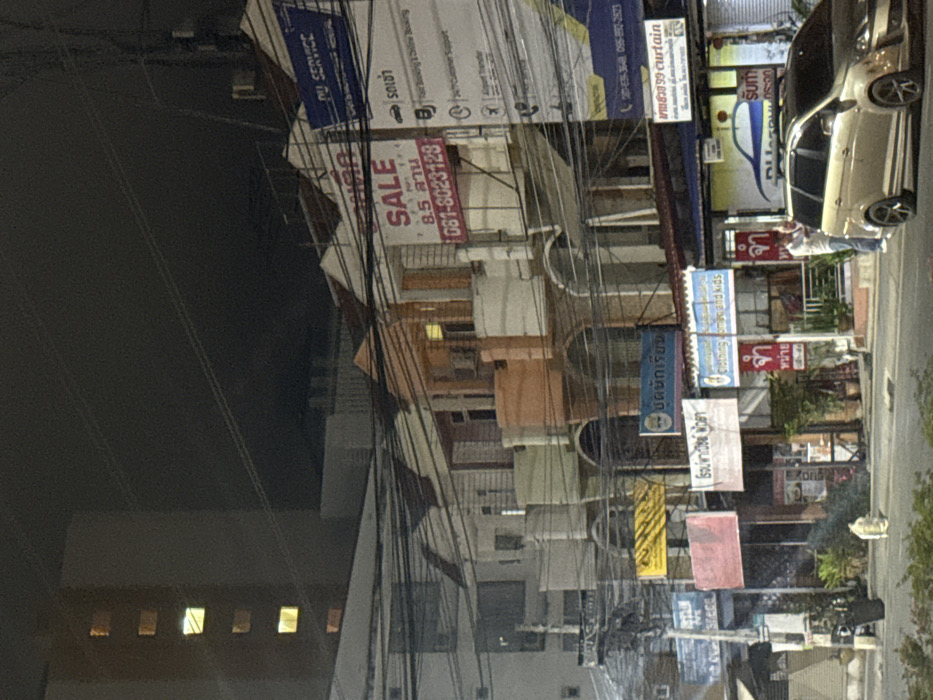 The image presents a nighttime urban street scene in Pattaya City, Thailand. **Location:** Pattaya City, Thailand. This is indicated by multiple signs in Thai script, including one explicitly translating to "Pattaya Hotel." **Environment:** The scene is characterized by dark skies and illumination from artificial light sources, denoting nighttime. A tall, modern building with several illuminated rectangular windows is visible in the distant background on the left. The foreground consists of a paved road surface on the left and a concrete sidewalk on the right. An extensive, tangled network of black electrical and communication cables crisscrosses the upper and middle portions of the frame. **Subjects and Objects:** - **Buildings:** A row of multi-story commercial shop-houses lines the right side of the street. These structures display diverse pastel hues, including white, cream, light orange, and dark orange, with several featuring ground-floor arched facades. Air conditioning units are mounted on their exteriors. - **Signage:** Numerous business signs, predominantly in Thai script, are affixed to the buildings. A prominent pink "SALE" sign displays "8.5 ล้าน" (8.5 million) and a phone number "081-6023129." Other visible signs include "DU SERVICE," "Car Rental," "Pattaya Hotel," "Clothing shoes and kids," "Come and Learn," and "Madam 99 Curtain." A yellow sign featuring a man's portrait is also present. - **Vehicles:** A gold-colored minivan, equipped with aftermarket multi-spoke wheels, is positioned on the right side of the road. - **People:** - One adult male, wearing a light-colored short-sleeved shirt and dark pants, stands on the sidewalk adjacent to the driver's side of the gold minivan, facing left. - A second individual is partially obscured near the minivan. - One individual is seated on the sidewalk on the far left, near a dark cylindrical trash receptacle. - One individual is kneeling or squatting on the sidewalk on the right, near some potted plants. - **Miscellaneous:** Several potted plants are arranged on the sidewalk in front of various businesses. A dark cylindrical trash bin is located on the far left portion of the sidewalk. **Actions and Interactions:** - The male near the minivan is standing stationary. - The minivan's status, whether parked or in slow motion, is not definitively discernible from the image. - The individuals on the sidewalk are in static postures.