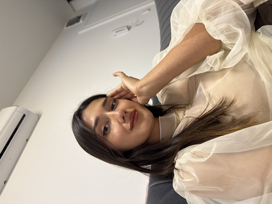 The scene depicts a young adult female seated indoors, capturing a selfie or close-up portrait