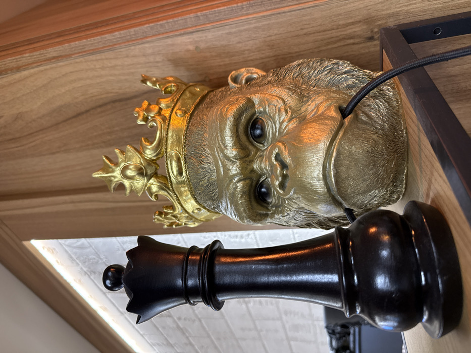 An indoor scene in Plovdiv, Bulgaria, displays a static arrangement of decorative objects on a light-toned wooden shelf. On the left, a large, matte black chess queen piece stands upright, characterized by its classic segmented design with a rounded base, a tapering body, and a multi-pointed crown topped with a small spherical finial. To its right, and slightly behind, is a metallic gold sculpture of a gorilla's head, intricately textured to represent fur and featuring distinct facial features including deep-set eyes with dark pupils and a prominent jawline. This gorilla head wears an ornate, multi-pointed golden crown. A flexible, black braided cable emerges from the gorilla's mouth, curving downwards and out of frame. The background behind the chess piece consists of a white, possibly tiled or brick-patterned wall segment, illuminated by a strip of concealed lighting from above. To the right, behind the gorilla head, a warm-toned wooden wall with vertical grain is visible. Below the shelf, a dark metal frame of a shelving unit is partially discernible.