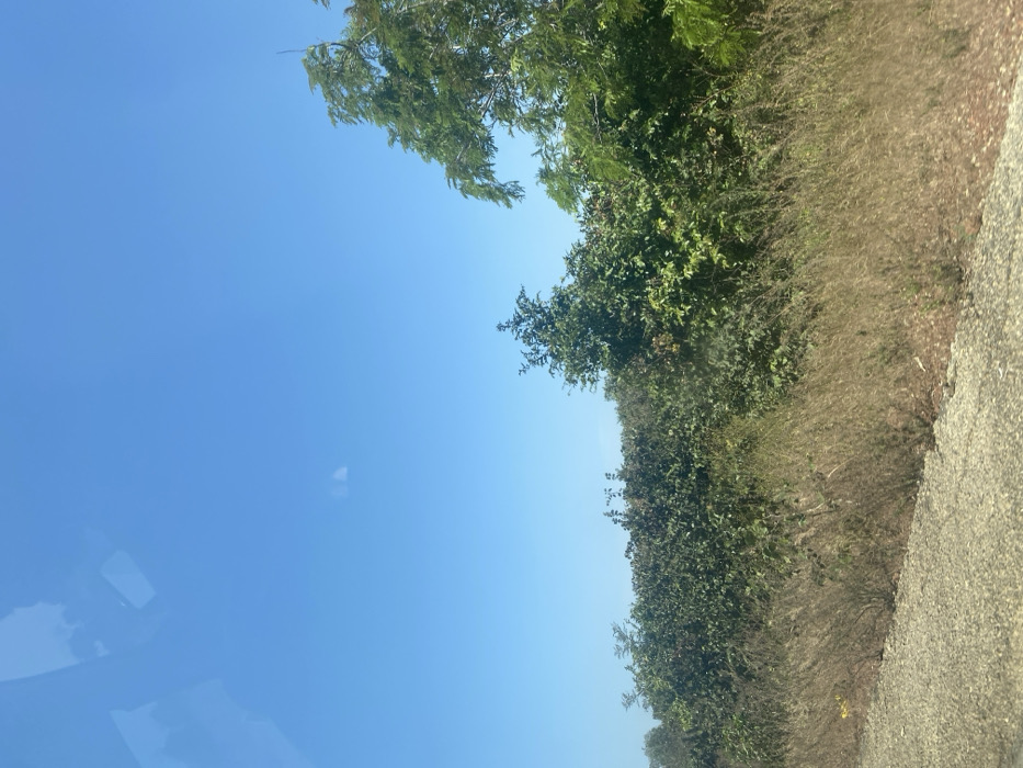 A daytime scene near Gumel, Nigeria, displays a natural landscape viewed from a low angle, likely from a vehicle due to subtle reflections in the upper sky. The upper half of the image features a clear, bright blue sky with no significant clouds. A continuous band of dense green foliage, comprising various bushes and trees, stretches horizontally across the middle ground. Notable are a tree with lighter green, feathery leaves on the far right, extending towards the top corner, and a more compact, dark green tree to its left. The foreground consists of dry, light brown grasses and weeds, leading down to a visible dark grey and brown gravel or dirt road shoulder at the bottom. No people, animals, or man-made structures are present within the visible frame.