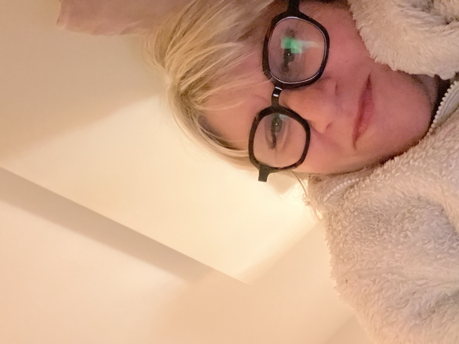 A woman wearing black framed glasses and a cream colored fuzzy jacket looks down at the camera. Her blond hair is visible at the top of her head. The background is mostly a white or light beige colored flat surface that takes up the majority of the frame. It is lit from above creating a soft shadow. The woman's face is well lit.