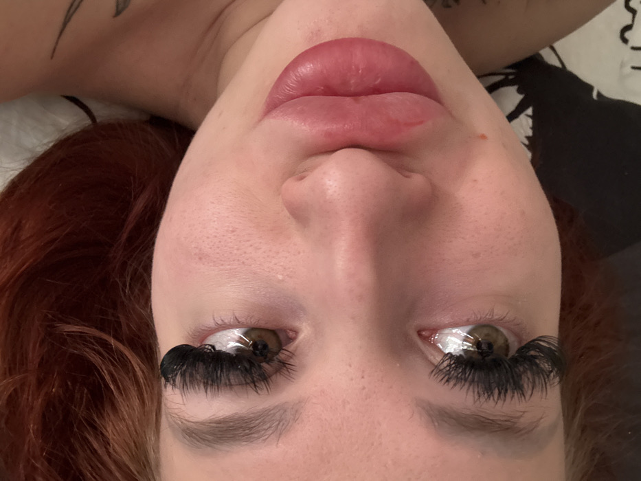 A close-up, angled photographic portrait captures the face of a single individual. The person exhibits fair skin with visible pores and has reddish-brown hair, partially visible at the top and left of the frame. Both eyes are open, revealing brown irises and featuring prominent, dark, voluminous false eyelashes curled upwards. The lips are full, distinctly pink-red, and appear volumized. A portion of a dark garment with a white pattern and a black tattoo on the neck/shoulder area are visible on the right side of the frame. The individual is looking directly towards the camera's perspective. This scene is depicted as occurring in Перовское сельское поселение, Ukraine.