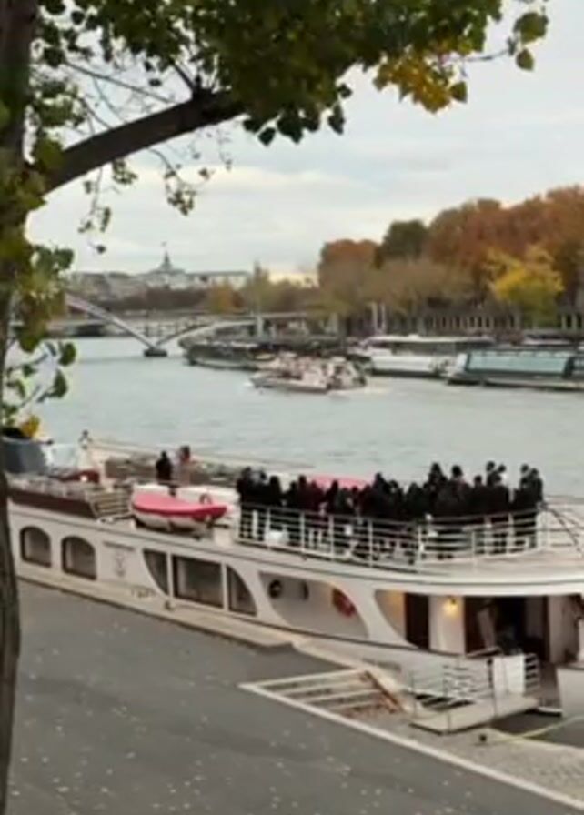 river scene in Paris, France. A large passenger boat is docked along the riverbank, with a crowd of people standing on its upper deck. The people are mostly dressed in dark clothing. In the background, another boat moves along the river. A bridge spans the river in the distance. Trees line the riverbanks, with autumn foliage visible. The sky is overcast. A tree branch partially obscures the view in the foreground.