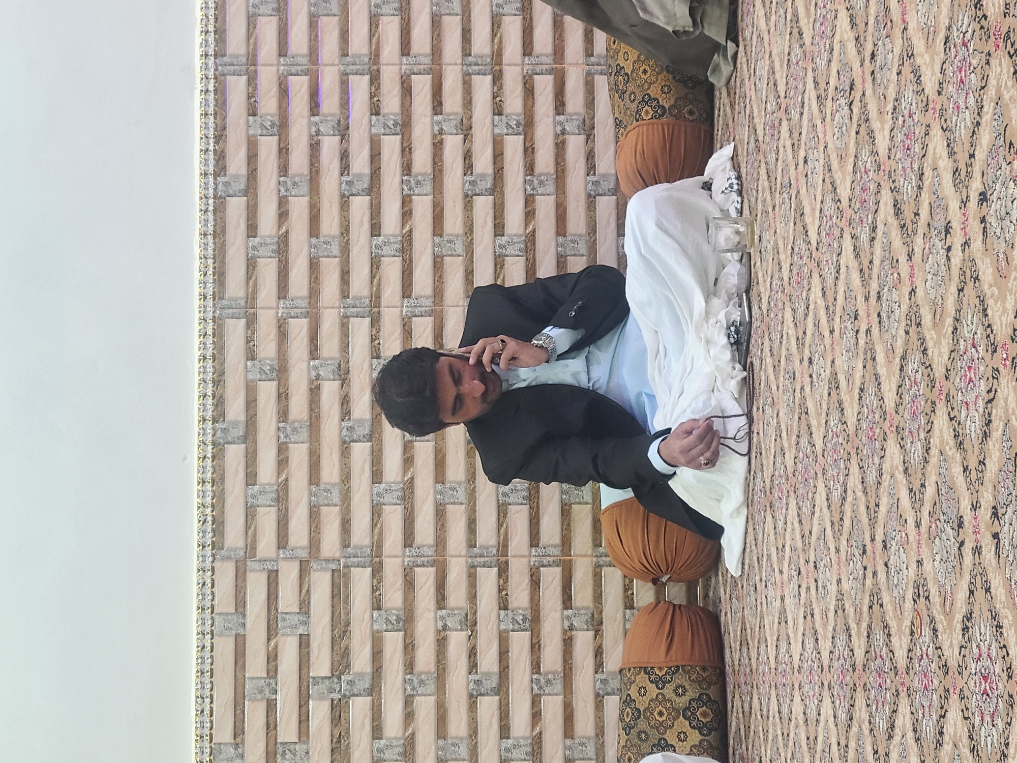 A man is seated on a patterned surface with several round cushions. He is dressed in a black suit and a light blue shirt. He is engaged in a phone call. The background features a wall with a brick-like pattern. This scene is located in Quetta City Tehsil, Pakistan.