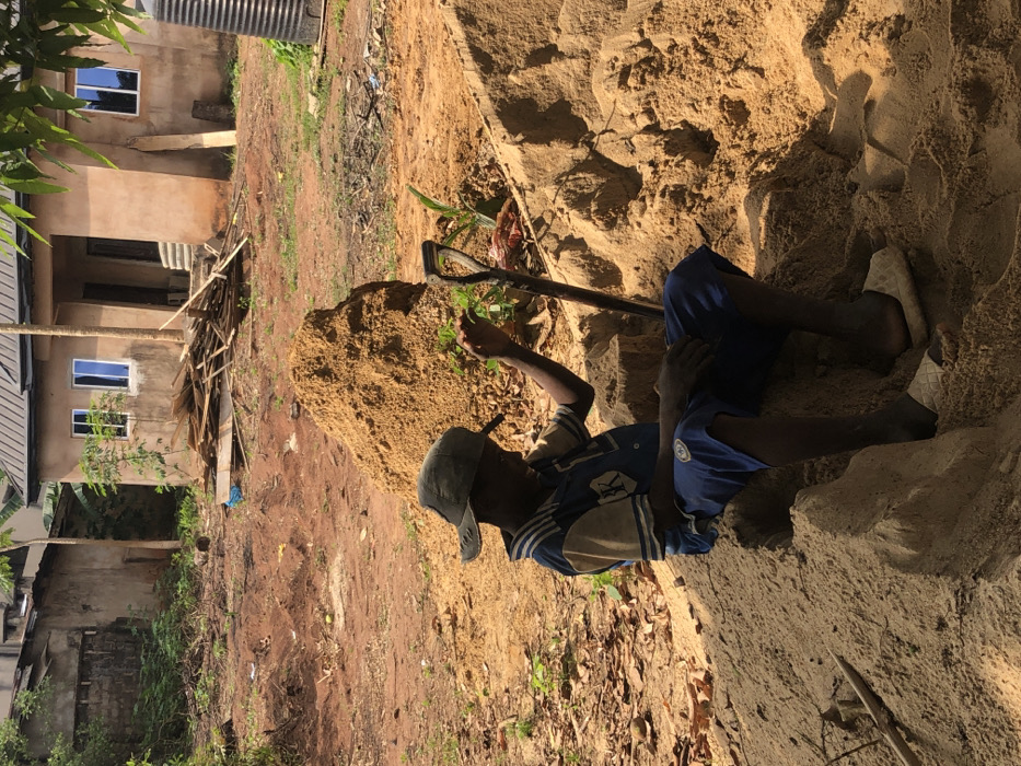 In Alor, Nigeria, an outdoor scene depicts a young male individual seated on a substantial mound of light brown sand in the foreground. He wears a dark cap, a blue and beige short-sleeved shirt with a "K" emblem, blue shorts, and white slip-on sandals. His right hand is raised near sparse green foliage, while a shovel with a dark handle and silver blade rests upright in the sand to his right. Behind the seated figure, another large sand mound is visible. The midground consists of reddish-brown bare earth, scattered with wooden planks and debris. In the background, a light brown, two-story building with a dark pitched roof, two windows featuring white frames and reflective blue glass, and a visible doorway is present on the right. A stack of lumber is positioned in front of this structure. A black water tank stands on the far right edge of the frame. To the left, a partially obscured, lighter-colored building with a dark roof and a brick wall section is visible. The environment includes sparse trees and shrubs under natural daylight conditions.
