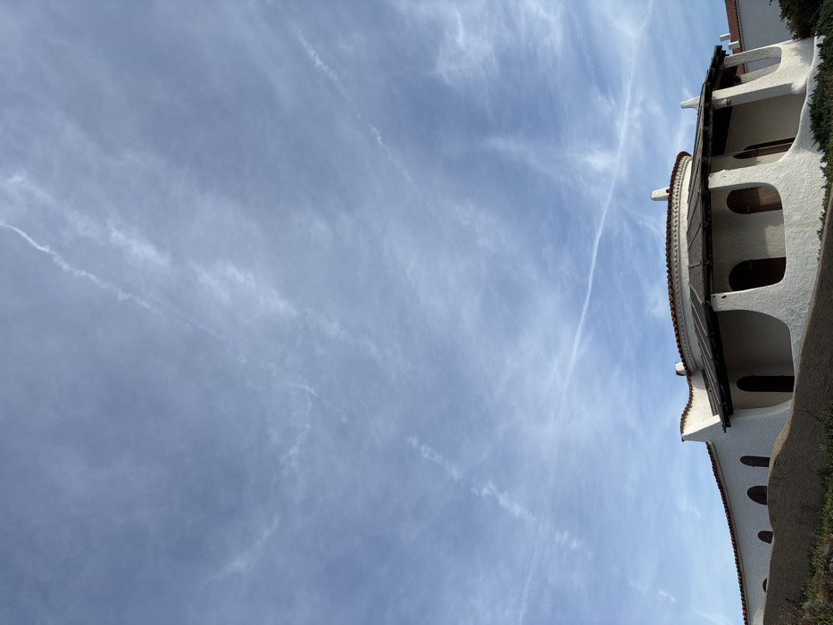 The image displays a low-rise, whitewashed building with a terracotta-tiled roof, situated in the city of Paduledda, Italy. The structure features a long, curved section on the left with multiple arched openings, some fitted with dark wooden shutters. To the right, a prominent semi-circular section includes a covered veranda with curved, organic-shaped support pillars and dark wooden door or window shutters. The building is partially obscured at its base by an undulating mound of dark earth or low-lying vegetation. The sky occupies the upper three-quarters of the frame, exhibiting a light blue hue with scattered cirrus clouds and distinct contrails. No individuals are present.