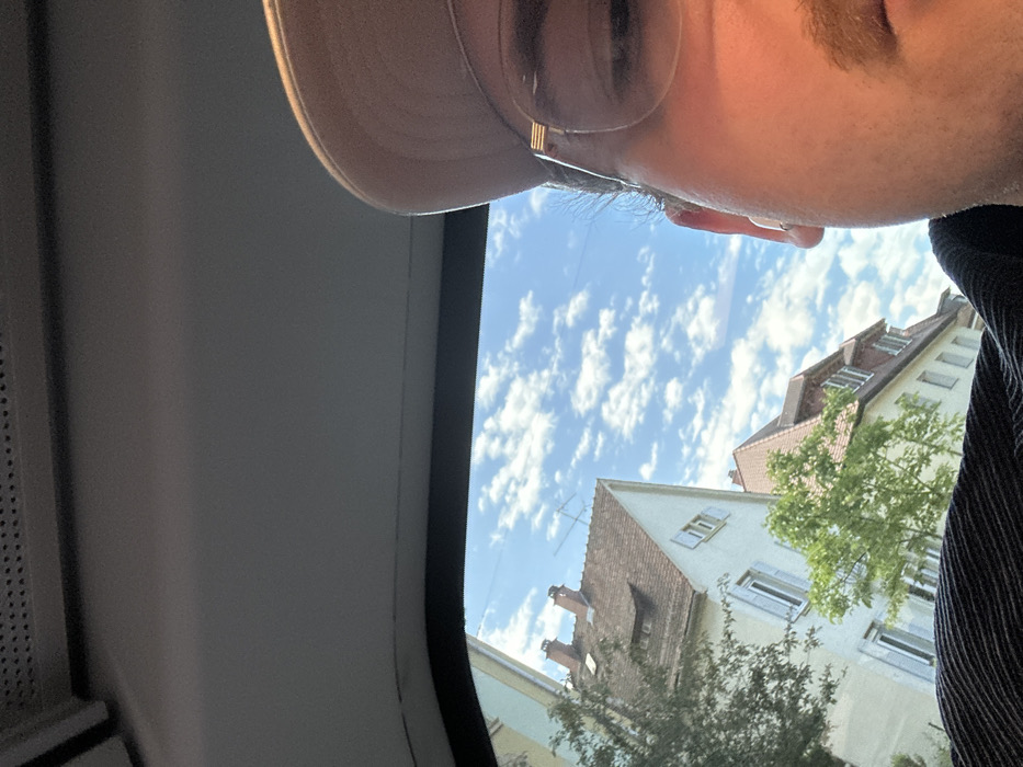 man's face, from the nose to the top of his head, in close-up, looking out the window of a car. The man is wearing a white baseball cap, gold-rimmed glasses, and an earring in his left ear. He has a mustache. The background is a view of a residential neighborhood in Heidelberg, Germany, at latitude 49.4 and longitude 8.69. The view is a cloudy blue sky and houses with white and yellow walls and brown roofs. There is a green tree to the left, with the house's eaves visible at the bottom of the image. The man's left shoulder and the upper part of his black, possibly corduroy shirt, are visible. The top of the car's interior is grey and the window is partially obscured by a thick black frame.