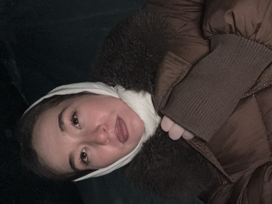 A young woman lies on a dark green surface, wearing a white hood and a brown, quilted winter jacket with a furry collar