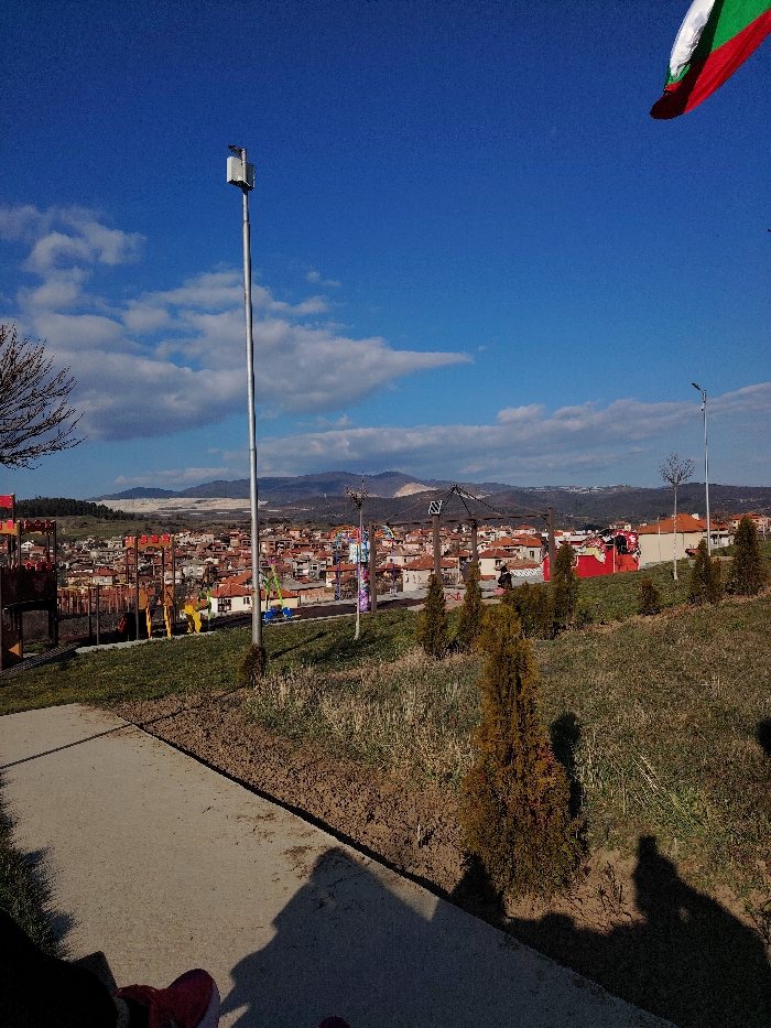 The image depicts an elevated view of the town of Poibrene, Bulgaria, under a clear blue sky with scattered white clouds. In the immediate foreground, a concrete path is visible, partially shadowed by an unseen object or individual, revealing the toe of a red shoe and the elongated shadows of at least two persons. The foreground transitions into a grassy slope interspersed with patches of exposed soil, dotted with several small, conical evergreen trees. A tall, grey metal pole with a white rectangular apparatus on top stands centrally. To the left, a children's playground with various colorful structures, including slides and climbing frames, is partially visible. Further into the mid-ground, a dense cluster of residential buildings with numerous red-tiled roofs defines the townscape of Poibrene. Among these buildings, a hexagonal metal gazebo structure and additional street light poles are discernible. A partial view of the Bulgarian national flag (white, green, red stripes) is visible in the upper right corner, partially unfurled against the blue sky. In the background, rolling hills and mountains frame the town, with a prominent light-colored, possibly quarried, area visible on one of the distant hillsides. The overall scene suggests a sunny day with clear visibility. No explicit actions or interactions are depicted beyond the presence implied by the foreground shadows.