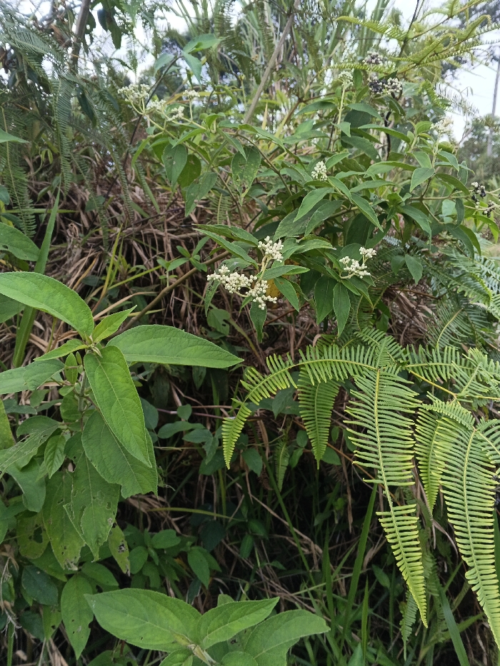 This image depicts a dense botanical scene, likely located in the vicinity of Chengdu, China. The central focus is a woody plant or shrub featuring medium-green, ovate to lanceolate leaves. Numerous clusters of small, spherical structures are present: some are pale yellow to off-white flower buds, while others are dark, purplish-black, mature berries, consistent with a species of Callicarpa. To the right, several vibrant green fern fronds are visible, characterized by their pinnately compound structure. The background and lower portions of the frame are filled with a mix of other green foliage and dry, straw-colored plant material. No human subjects, animals, or man-made objects are present. The scene is illuminated by natural, diffuse light.