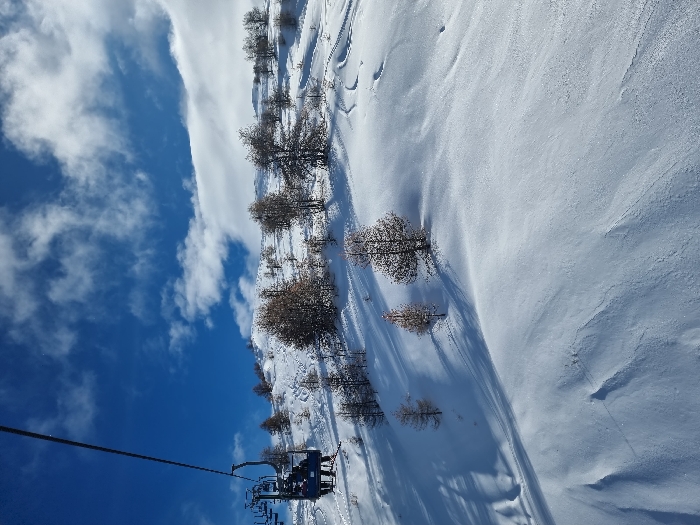 This image displays a winter mountain scene in Sauze d'Oulx, Italy. A blue chairlift carrying at least two individuals, observed from behind, ascends a snow-covered slope in the upper left quadrant. The individuals are clad in dark winter attire. The expansive landscape consists predominantly of white snow, showing varied textures, undulations, and multiple ski tracks traversing the slopes. Numerous trees, including both deciduous varieties with sparse brown foliage and evergreen conifers, are scattered across the snow-covered hills. The sky above is a clear, vibrant blue, punctuated by white cumulus clouds, with a distinct horizontal cloud formation visible towards the right horizon. Bright daylight illuminates the scene, creating shadows from the trees and terrain features on the snow.