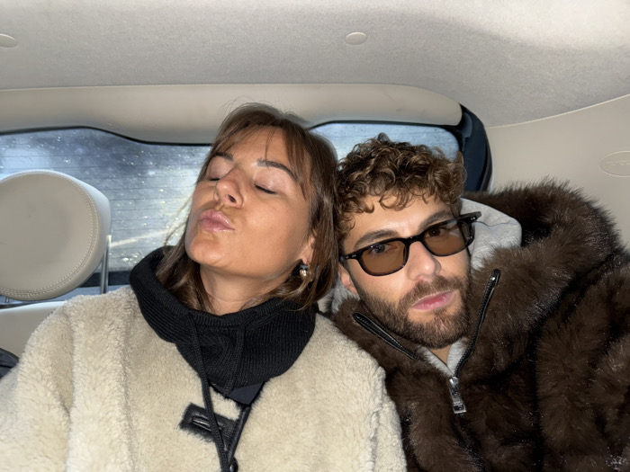 A woman and a man are seated in the back of a car. The woman on the left is wearing a tan fleece jacket with a black hooded scarf, eyes closed, and pursed lips. The man on the right has curly hair, a beard, and is wearing dark glasses. He's sporting a brown fur coat over a gray hooded sweatshirt. The back window behind them appears wet or dirty. The interior of the car is light-colored.