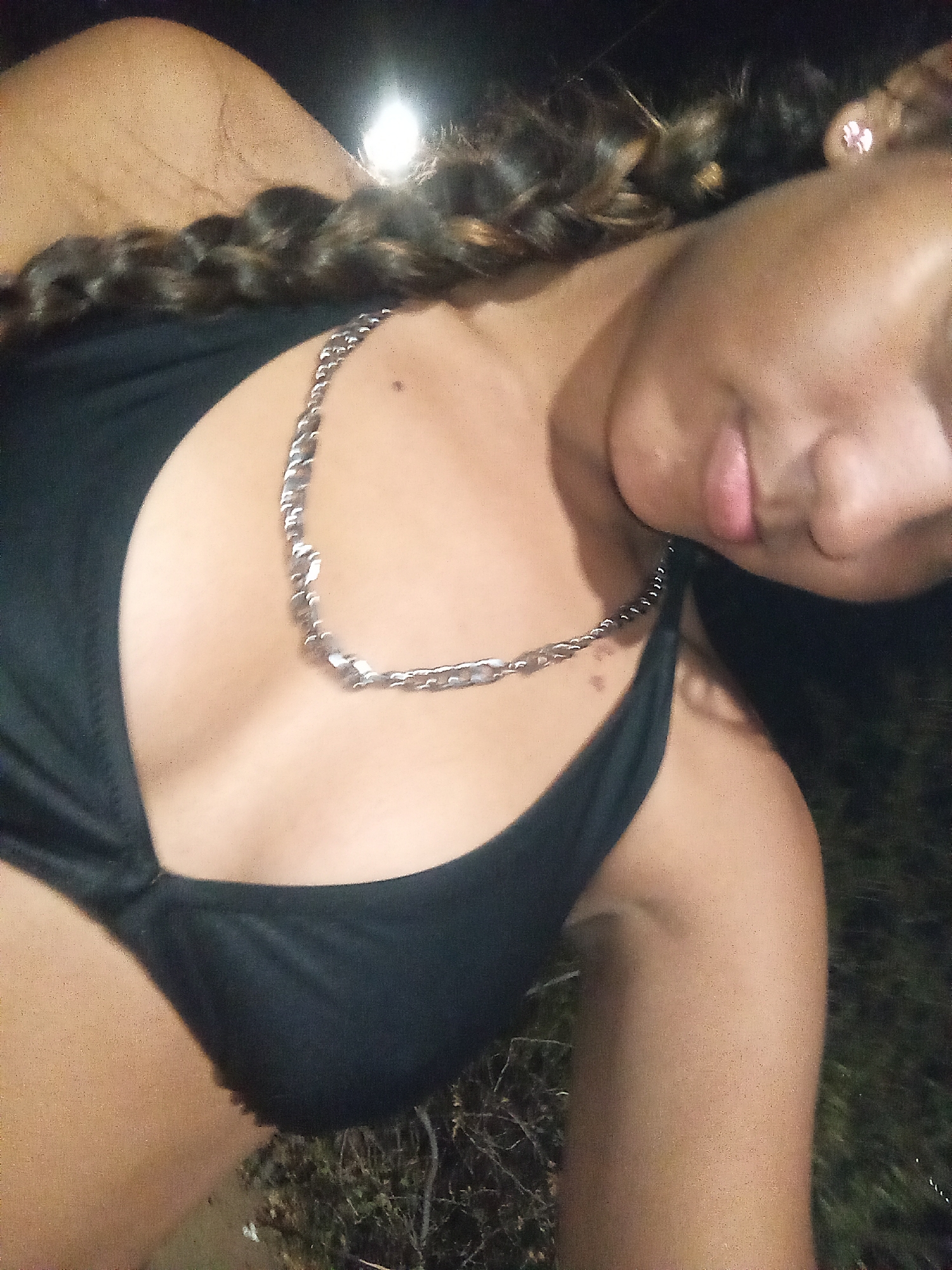 A medium shot of a woman with dark braided hair, wearing a black top and a silver chain necklace. She appears to be lying on the ground, possibly outdoors in a dimly lit area with grass or shrubbery visible at the bottom of the frame. The background is dark, with a bright light source that looks like a streetlight or moon in the far distance. The location is implied as Juan Griego, Venezuela.