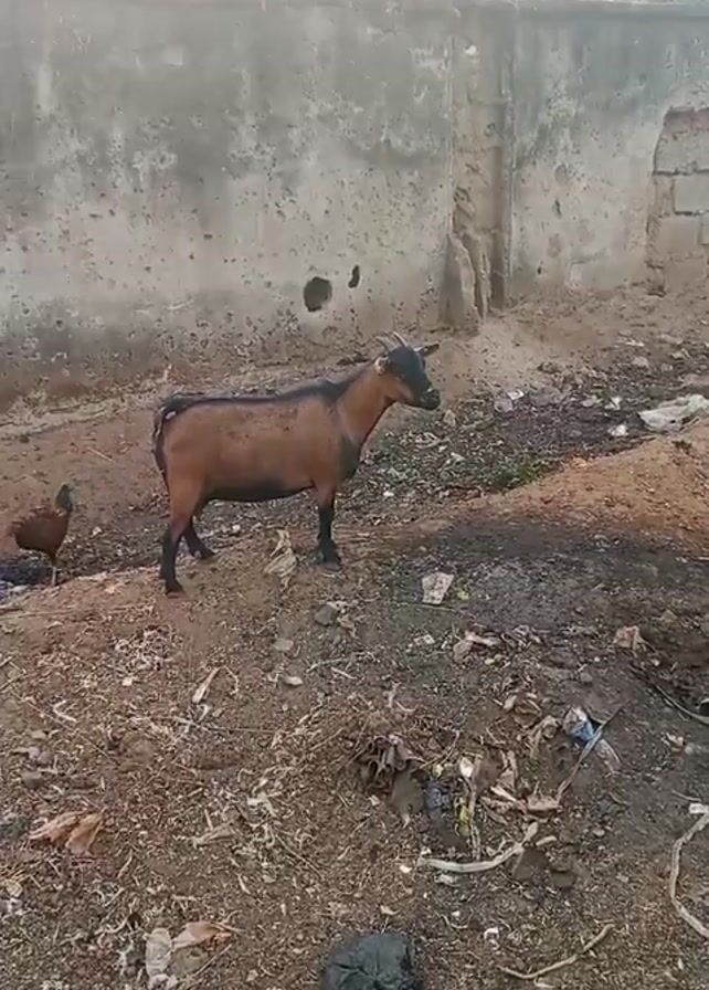 goat and a chicken in a dirty environment with a concrete wall and trash. The camera pans quickly to reveal a building with clothes hanging on a line in the backyard. The ground is dirt and rubble.