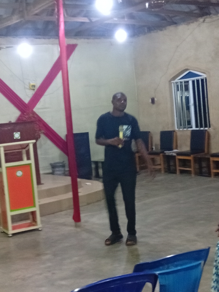 A man stands in an indoor space, possibly a church or hall, dressed in a black t-shirt and pants with sandals. He is holding an object, possibly a microphone or remote. Behind him are rows of chairs, a window with bars, and a podium decorated with red fabric. The room is lit by several bright overhead lights. In the foreground are the tops of some blue plastic chairs. The floor appears to be a smooth, gray material.