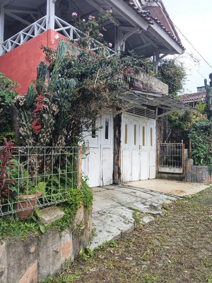 This image depicts the exterior of a two-story building located in Unknown, Cambodia. The ground level features two sets of weathered white bifold or folding doors, each comprising multiple rectangular panels, suggesting an entrance to a garage or a ground-floor unit. Above these doors, a small, corroded corrugated metal awning is visible. A robust tree trunk appears to be integrated into the structure between the two door sets. To the right of the doors, a smaller, rusty metal gate provides access to an adjacent paved area. The upper level of the building presents a distinct red wall section and a white wooden balcony railing characterized by diagonal cross-bracing. Pink-flowered vines are observed growing over and around this railing. The building is topped with a white roof overhang and reddish-brown roof tiles. The surrounding environment is characterized by dense and somewhat overgrown vegetation. On the left, a rusty metal mesh fence encloses a garden area containing several tall, segmented cacti with dried remnants of flowers or fruit, various green leafy plants including ferns, and a terracotta pot holding a reddish-foliage plant. Green ground cover and weeds are visible along the concrete retaining walls and pathways. The ground in the foreground consists of concrete pathways with visible tire tracks, interspersed with sparse, weedy vegetation. No individuals, actions, or interactions are present within the scene.