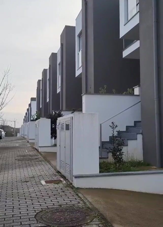 row of modern townhouses with grey and white facades. A paved walkway made of interlocking bricks runs along the front of the houses. Each house has a set of stairs leading up to the entrance. Some houses have small landscaped areas with young plants. There are utility boxes along the walkway. The sky is overcast. A streetlight can be seen in the distance. The video appears to be taken from a low angle, moving slowly along the row of houses.