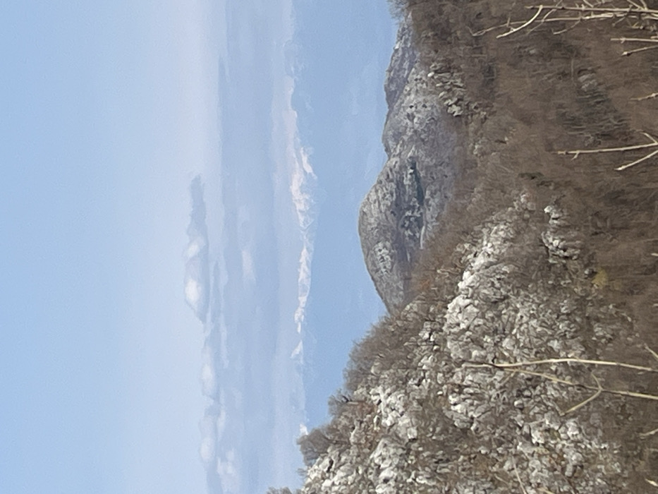 The image depicts a mountainous landscape located in or near Obzovica, Montenegro, under a clear, pale blue sky with scattered white cumulus clouds at varying altitudes. The horizon features a distinct, hazy range of distant mountains with visible snow or ice on their upper slopes. In the midground, a prominent rounded peak, characterized by exposed grey and white rock formations and sparse, leafless deciduous vegetation, dominates the central-right portion of the frame. To the left, foreground terrain consists of rugged, light-colored rocky outcrops intermingled with bare trees, some branches of which partially intrude into the lower right of the view. No human subjects, animals, or artificial structures are discernible. The overall scene indicates a natural, rugged environment, likely in a season outside of full foliage.