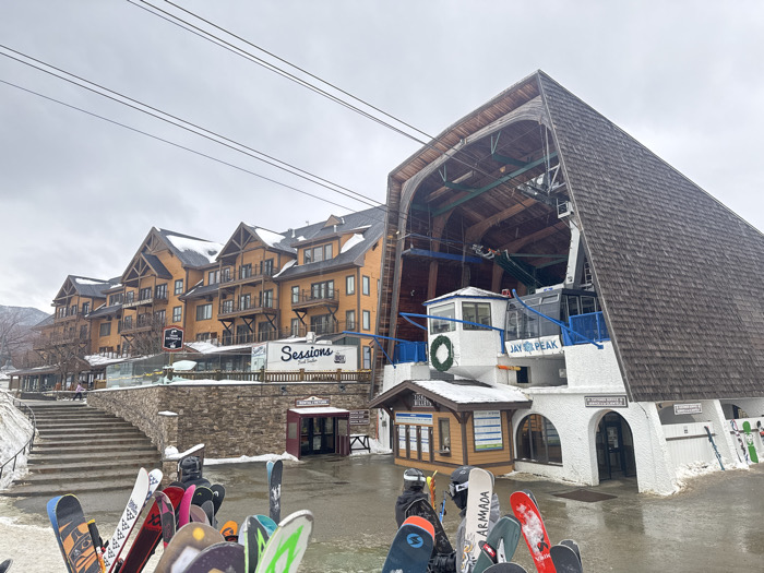 A view of Jay Peak resort. A large A-frame structure covered in wooden shingles towers over a white building with blue accents, marked "Jay Peak." In front, snowboards and skis are stacked. To the left, a multi-story hotel with balconies stands behind a stone wall and a set of stairs. The sky is overcast, and power lines run overhead.