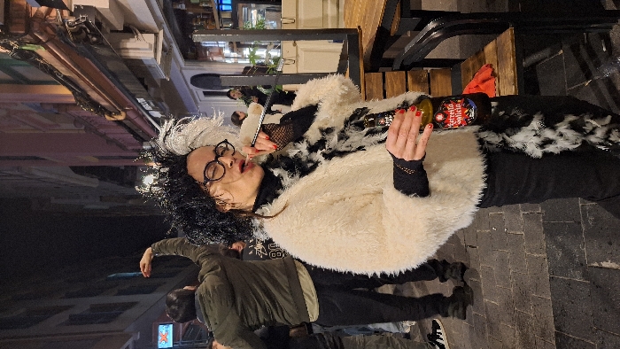 A woman in a Cruella de Vil costume leans back, drinking from a bottle of "Cerveza Galicia