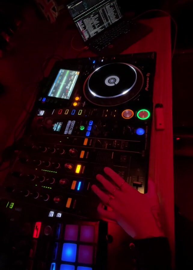 person’s hand operating a Pioneer DJ system in a room lit with red light. The DJ system includes a mixer with various buttons and knobs, as well as a CDJ with a screen and jog wheel. A laptop sits above the DJ system, displaying waveform information. The person’s hand is wearing a ring and appears to be adjusting the mixer. In the background, there’s what looks like a wheel decoration, and the lighting suggests a club or bar setting. Music plays throughout the clip.