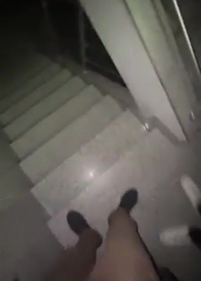 first-person view of a person walking down a flight of stairs. The stairs are made of a light-colored stone or tile. A second person's feet can be seen briefly as the person walks. The stairway has a metal handrail. A sign is partially visible at the top of the stairs. The lighting is dim.