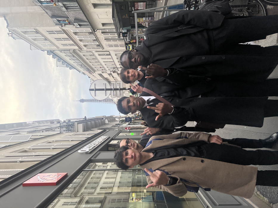 Five young adult males are positioned on a sidewalk of a narrow urban street in Paris, France, with the Eiffel Tower discernible in the far distance under an overcast sky