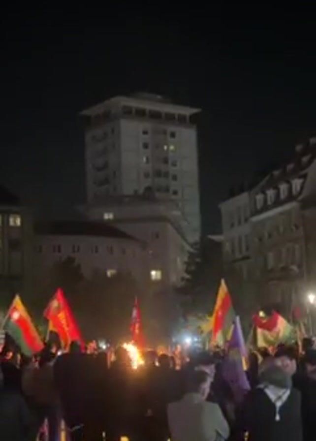 At night, a group of people stand around a bonfire in what appears to be a city square. Several individuals hold flags with a red star and green, yellow, and red stripes. The background includes a tall, multi-story building with lit windows. Other buildings with traditional architecture flank the square. The sky is dark. The overall impression is a demonstration or celebration taking place at night.