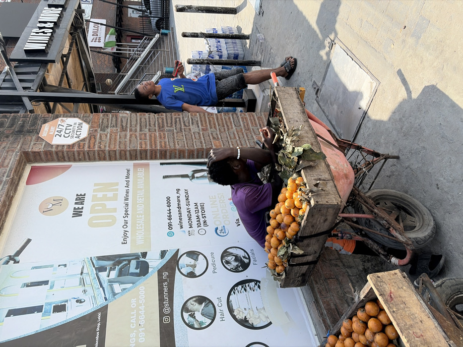 The image depicts a daytime street scene in Alaguntan, Nigeria, featuring two individuals and commercial establishments on a concrete sidewalk. In the foreground, a dark-skinned male wearing a purple short-sleeved shirt leans over a rustic wooden cart, which serves as a display for numerous small, round, orange fruits, some interspersed with green leaves. His forearms rest on the wooden crate as he looks downward. A second, similar fruit-filled cart is partially visible to the lower left. To the right, another dark-skinned male in a blue short-sleeved t-shirt with a yellow "LV" logo and dark, patterned shorts leans against a brick column. He wears black slide sandals, holds a small red object in his right hand, and looks upwards and slightly to the right. The adjacent brick building features large promotional signage. A prominent white poster advertises "WINES & MORE," stating "WE ARE OPEN," "Enjoy Our Special Wines And More!", and "WHOLESALE AND RETAIL AVAILABLE!" It includes contact details (091-6644-6000), a website (winesandmore_ng), and operating hours (Monday-Sunday, 10 AM-12 AM in-store, with online orders available). A second, partially visible poster to the left promotes "@stunners_ng," illustrating services such as "Hair Cut," "Pedicure," and "Facials." A hexagonal "SECURITY ALERT 24/7 CCTV SECURITY IN ACTION" sign is mounted on the brick column above the man in the blue shirt. Above this, a larger "WINES & MORE" sign is affixed to the building's exterior. In the midground, multiple stacks of bottled water are visible. The background reveals a multi-story building with "DILLON" signage and a Nigerian flag. The scene is brightly lit by natural sunlight, casting distinct shadows on the concrete ground.