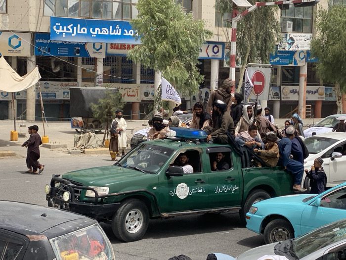 The image depicts a busy daytime street scene in Arghandab, Afghanistan